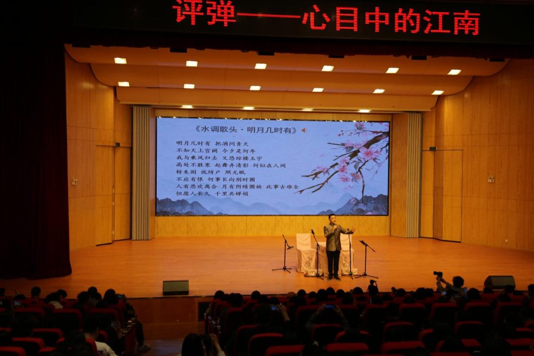 为了让同学们深刻感受江南曲艺的魅力,高博文一行为师生带来了评书、弹词经典曲目《姑苏好风光》《莺莺操琴》《杨八姐比武》《蝶恋花.答李淑一》《水调歌头•明月几时有》等,再次向大家展示了评弹的“说、噱、弹、唱、演”特殊的表演特点和艺术神韵。