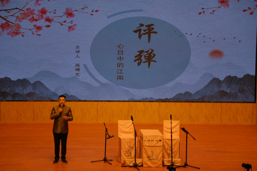 讲演现场,高博文以“评弹—心目中的江南”为题开展讲座,向大家介绍评弹艺术的发展历史。他指出,评弹起源于苏州,是一种江南曲艺,是观察江南社会的窗口。苏州方言的独特韵味,让其语调三回九转,韵味悠长。