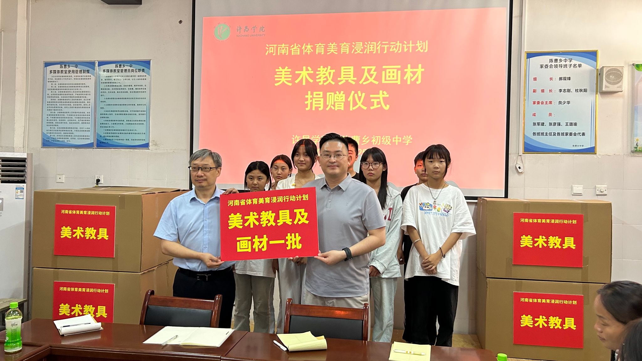 捐赠仪式上,张少华代表许昌学院向陈曹乡初级中学捐赠了美术教具等教学物资。他表示,这些物资将直接用于支持学校开发美育特色课程,助力美育兴趣社团建设。“美育是心灵的滋养,更是文化的传承。我们希望通过此次活动,为孩子们打开一扇触摸美、创造美的窗户。”张少华说。